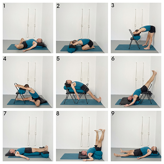 Each pose is held for several minutes with the body completely supported by bolsters, blankets, and blocks—allowing muscles to release and the mind to settle.